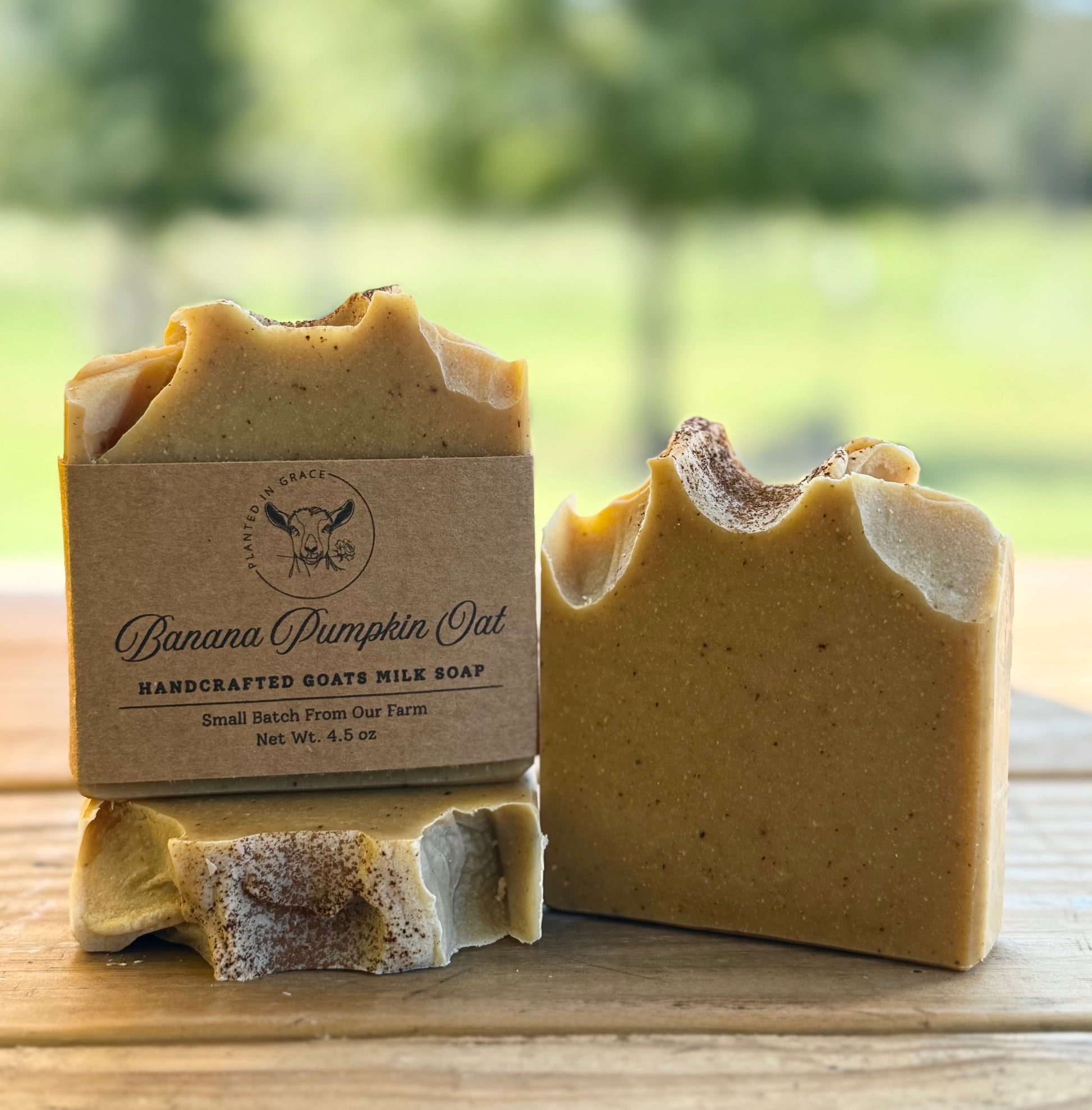 Saponified Oils of Olive, Coconut, Sunflower, Grapeseed and Castor, Coca Butter, Distilled Water, Sodium Hydroxide, Sodium Lactate, Colloidal Oatmeal, Banana Puree, Pumpkin Puree, Cinnamon Leaf and Nutmeg Essential Oil, Honey and Goats Milk