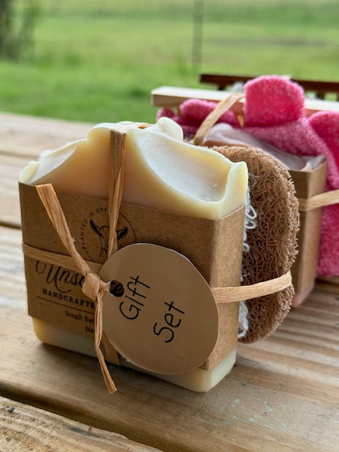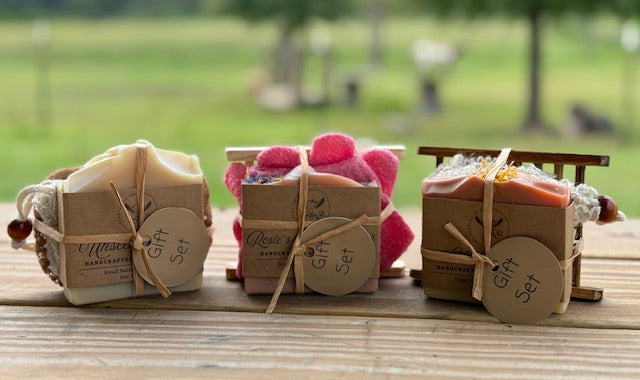 The perfect gift for any occasion! Each set will be different and will include one of our bars of soap and several other items such as a wooden soap holder, exfoliating bag or an exfoliating mitt or a surprise mix and match! I think the fun part is not knowing exactly what you will get, and I have the best time creating these special surprise gift sets.