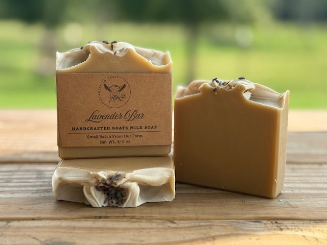 Saponified Oils of Olive, Coconut, Sunflower and Castor, Shea Butter, Sodium Hydroxide, Sodium Lactate, Distilled Water, Goats Milk, Lavender and Lemongrass Essential oils and Alkanet Root Powder