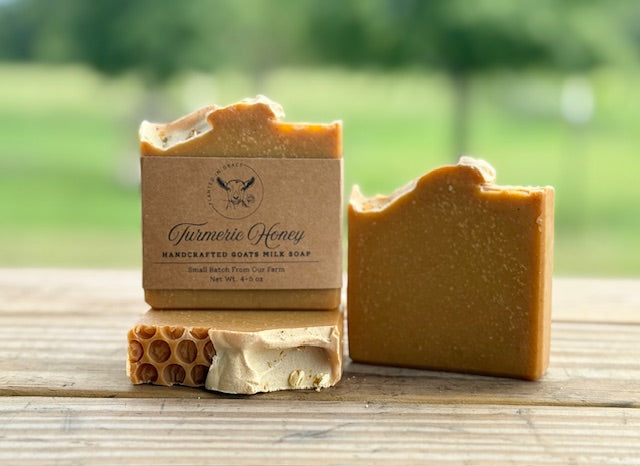 Saponified Oils of Olive, Coconut, Sunflower and Castor, Cocoa Butter, Tallow, Distilled Water, Goats Milk, Sodium Hydroxide, Sodium Lactate, Turmeric Powder, Turmeric and Ylang Ylang Essential Oils and Honey.