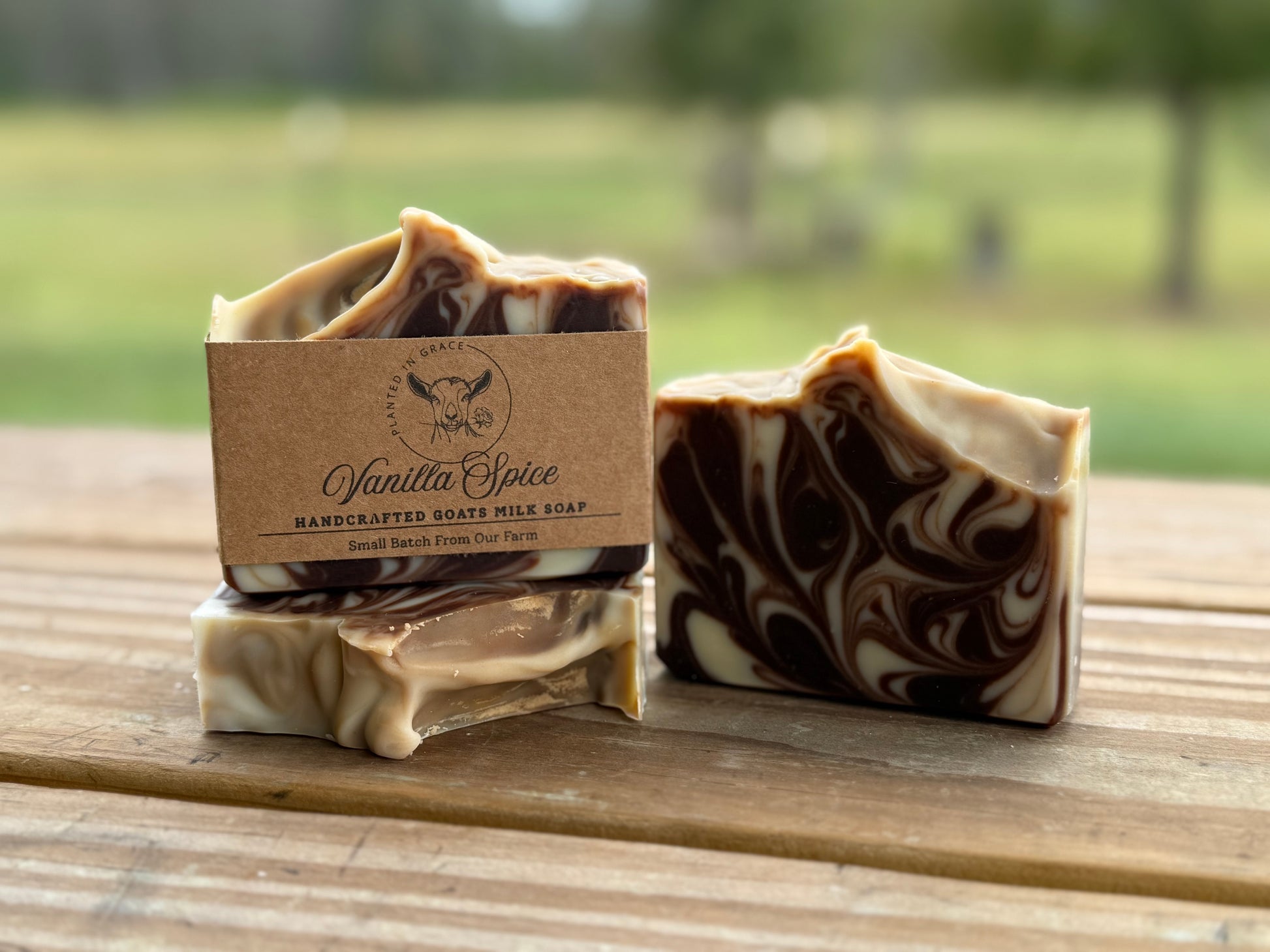 Saponified Oils of Olive, Coconut, Sunflower and Castor, Shea Butter, Tallow, Distilled Water, Goats Milk, Sodium Hydroxide, Sodium Lactate, Vanilla Oleoresin and Nutmeg Essential Oils, Cocoa Powder and Maple Syrup